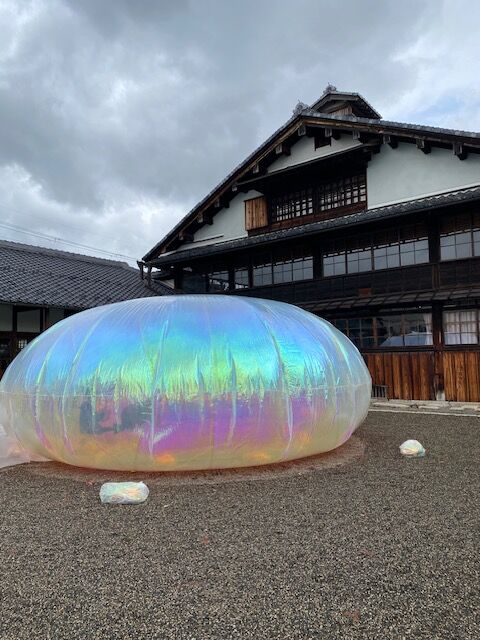 旧伴家住宅/奥中章人のバルーンの作品 大阪・関西万博にも展示されていました。 中に入ると大きなエアーマットがあり、寝転ぶことができます。 七彩の光が淡く広がり、幻想的な空間を体験できます。